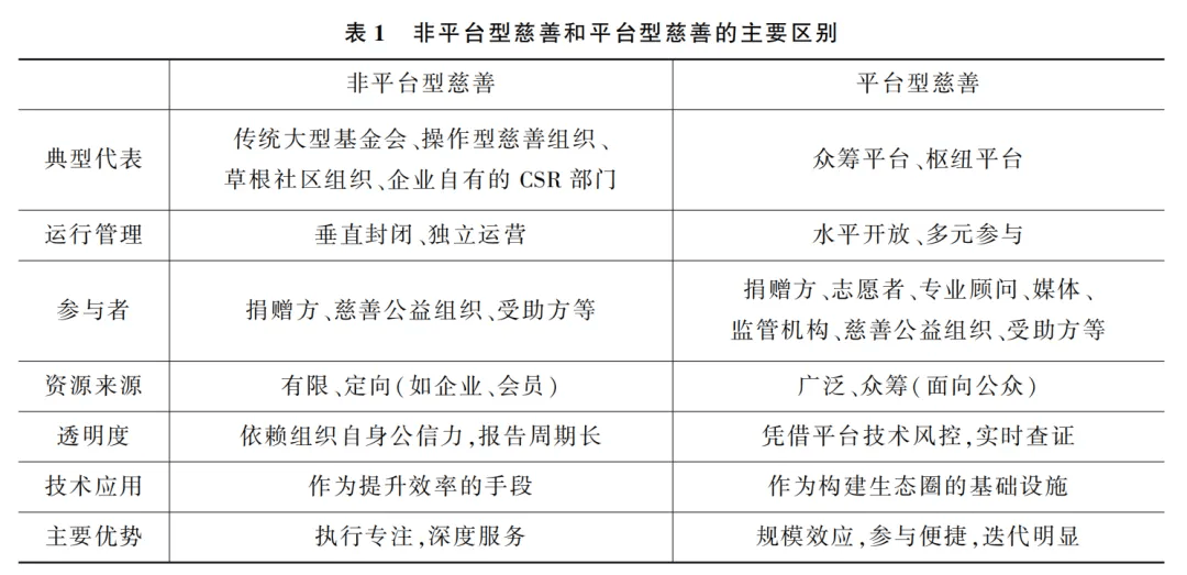 平台型慈善是针对传统大型基金会、操作型慈善组织、草根社区组织、企业自有的CSR部门等而提出的新分类。平台型慈善不仅是自己筹款和执行项目,而且是搭建并运营一个开放的平台,平台通过对多元主体行为和运行的全过程进行整体性数据收集、挖掘、分析,运用算法精准把握捐赠者行为特征,营造平台互动氛围,将慈善需求与公益资源(资金、物资、专业能力、时间等)进行精准、高效、大规模的匹配,同时对异质性主体行为进行有效的监控和选择。